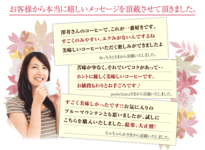 澤井珈琲では… 澤井珈琲では、お客様の元に届き、コーヒーの封を開けた時に「香り高さ」に感動と、飲んだときの、「味わい」に感動して頂く為に、ご注文を頂いてから焙煎をしてコーヒー豆、コーヒーをお届けをしております。